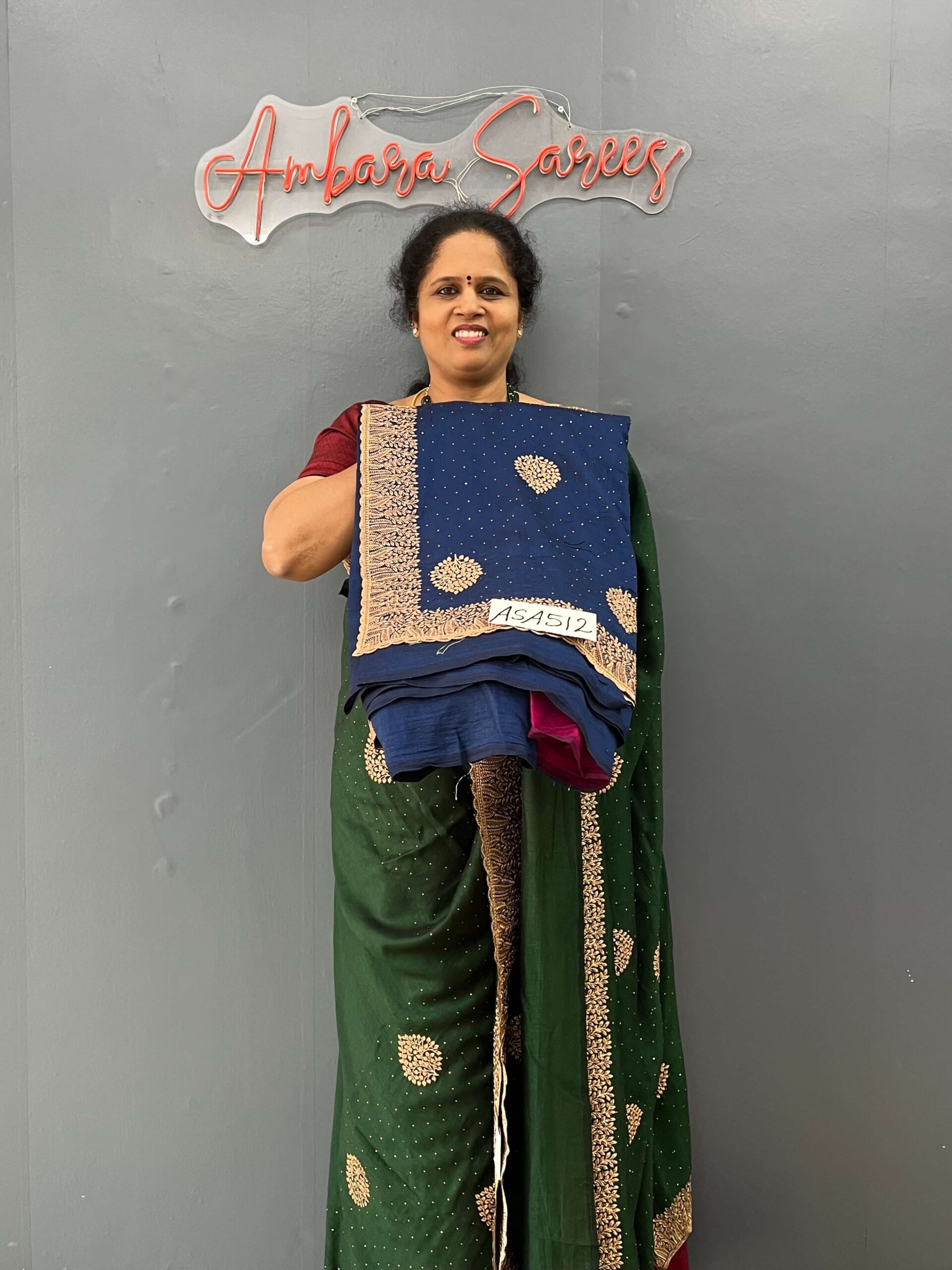 – Elegant dark navy blue chiffon saree with a soft and graceful drape