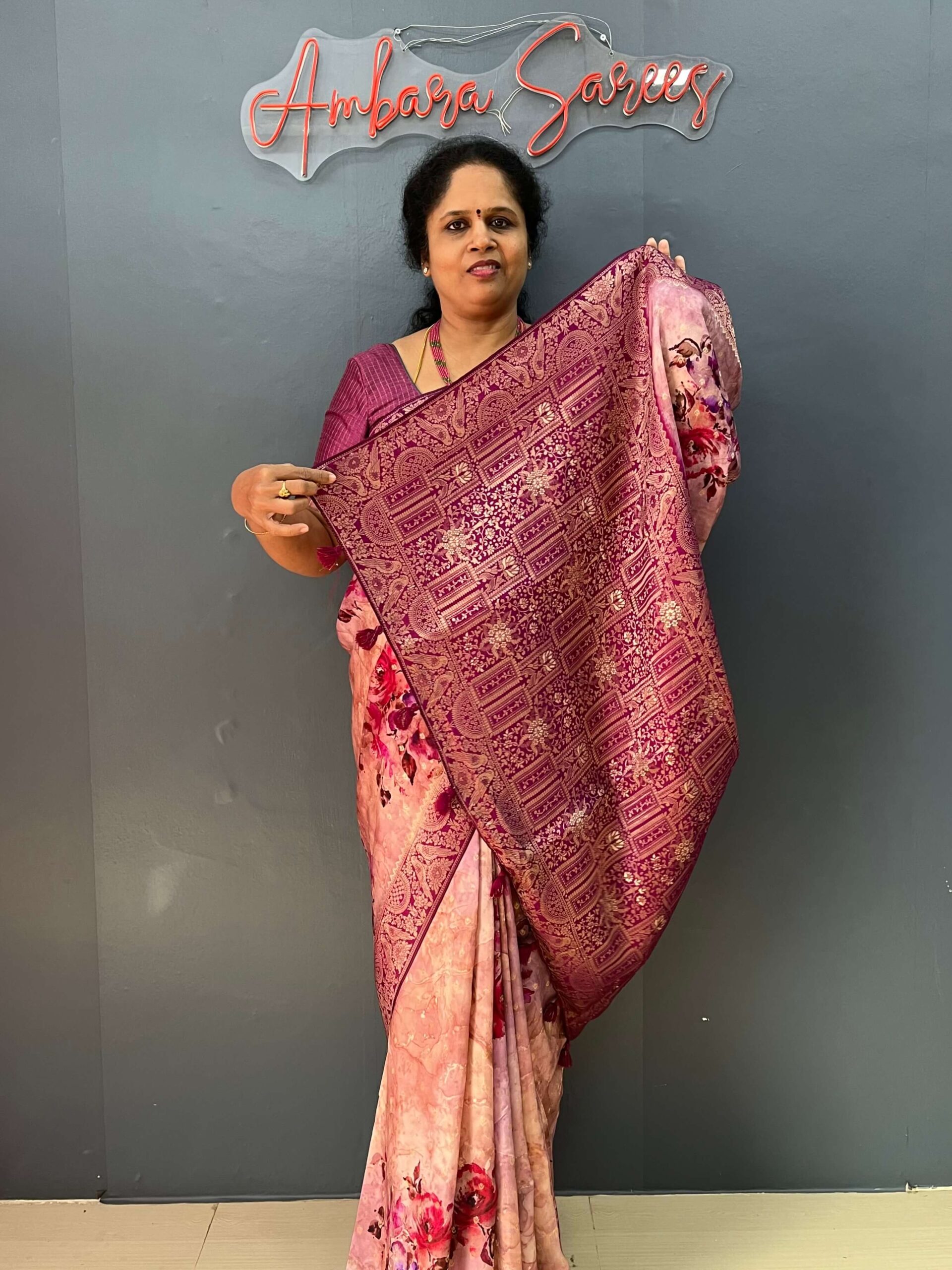 - Elegant print adorning the saree, adding a touch of charm