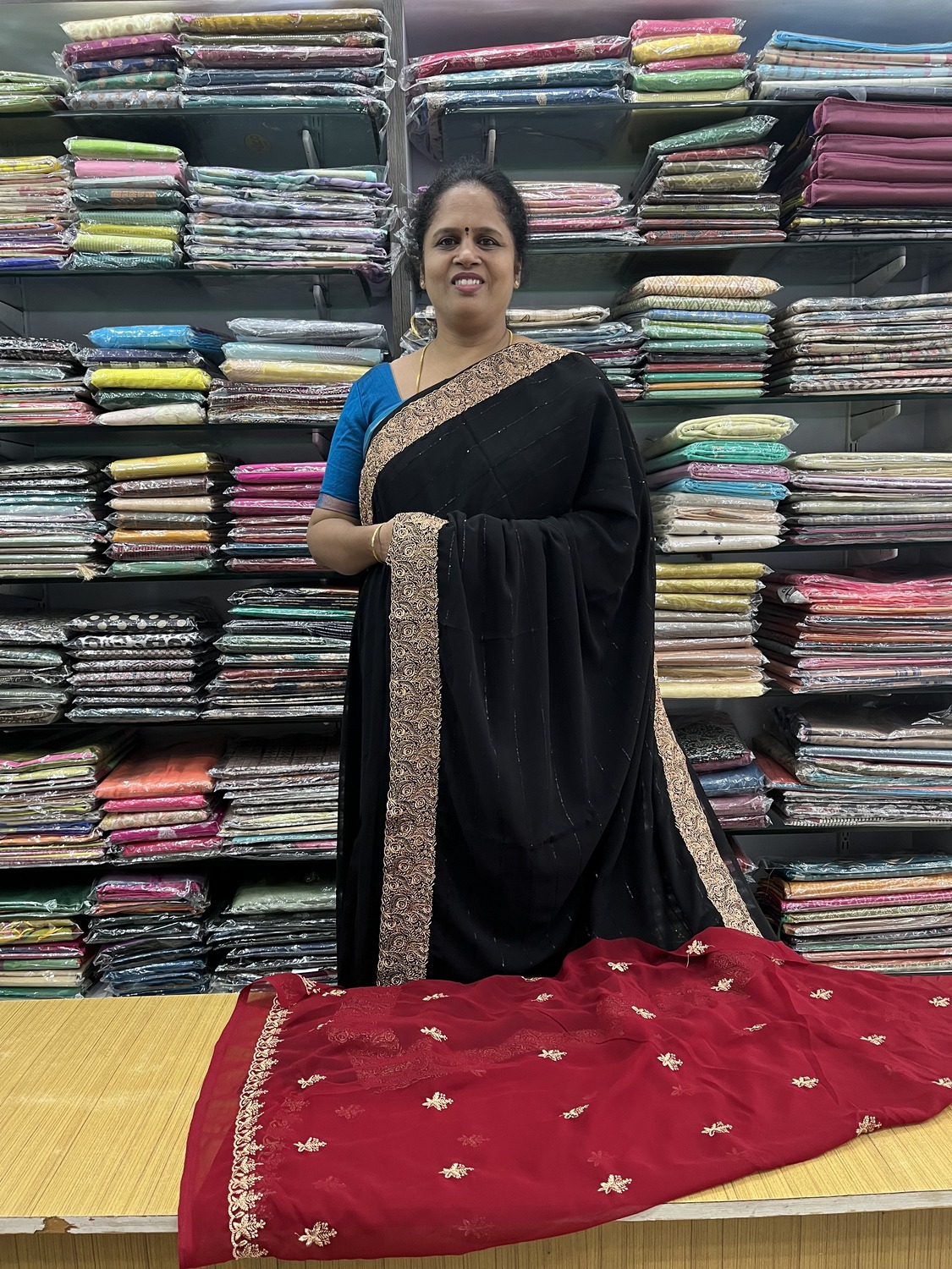 - Paired with a rich maroon blouse, adding a bold and classy contrast