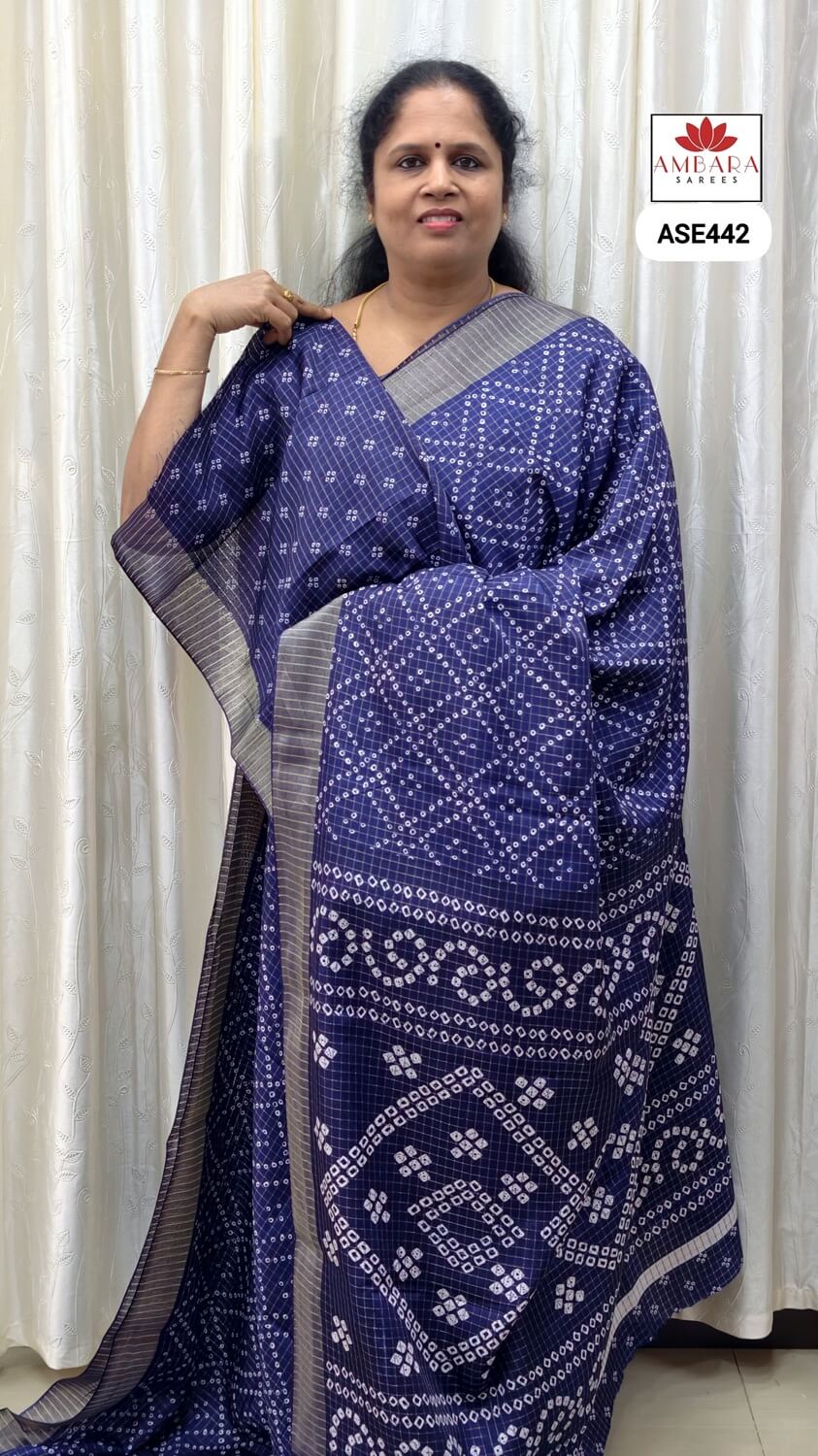 • Elegant Bandhini-inspired prints spread across the saree body, showcasing traditional tie-dye motifs with a refined, contemporary finish