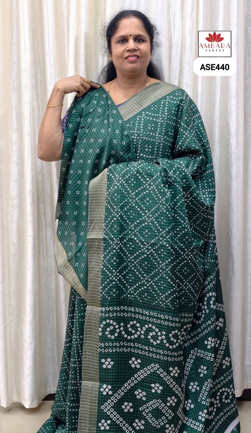 • Elegant Bandhini-inspired prints spread across the saree body, showcasing traditional tie-dye motifs with a refined, contemporary finish