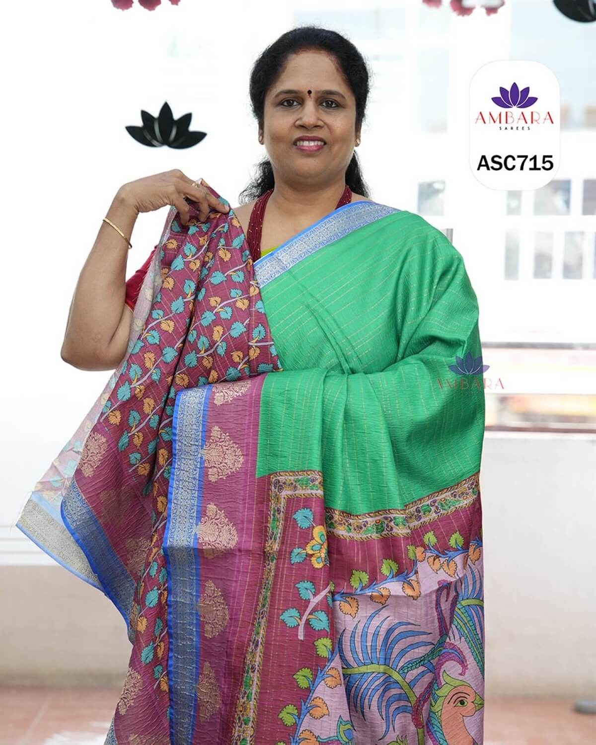 Kalamkari pallu with intricate traditional motifs, enhancing the overall ethnic appeal.