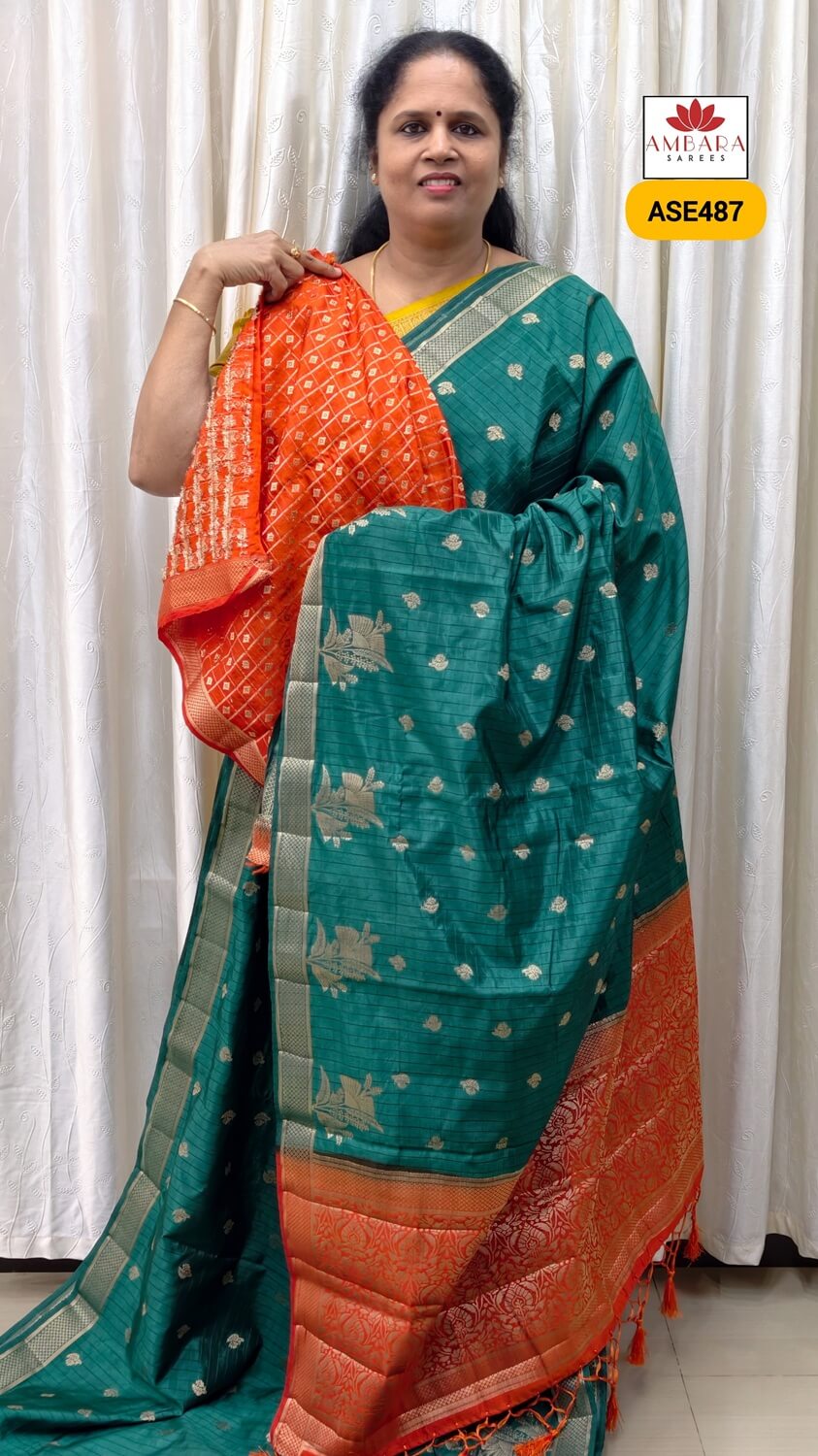 Green With Orange Semi Tussar | ASE487