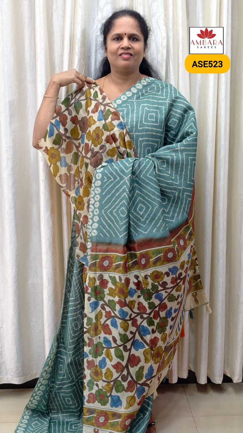 • The highlight of the saree is the Kalamkari printed pallu, featuring intricate traditional motifs such as floral vines, mythological patterns, and artistic elements that enhance the richness of the saree 🎨