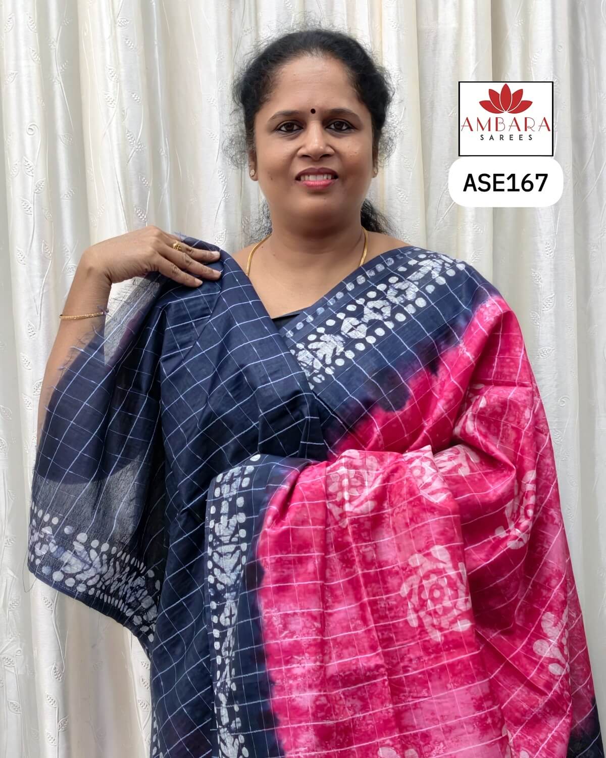 • Contrast colors used in the saree’s body to enhance the batik prints, making them more striking and visually engaging.