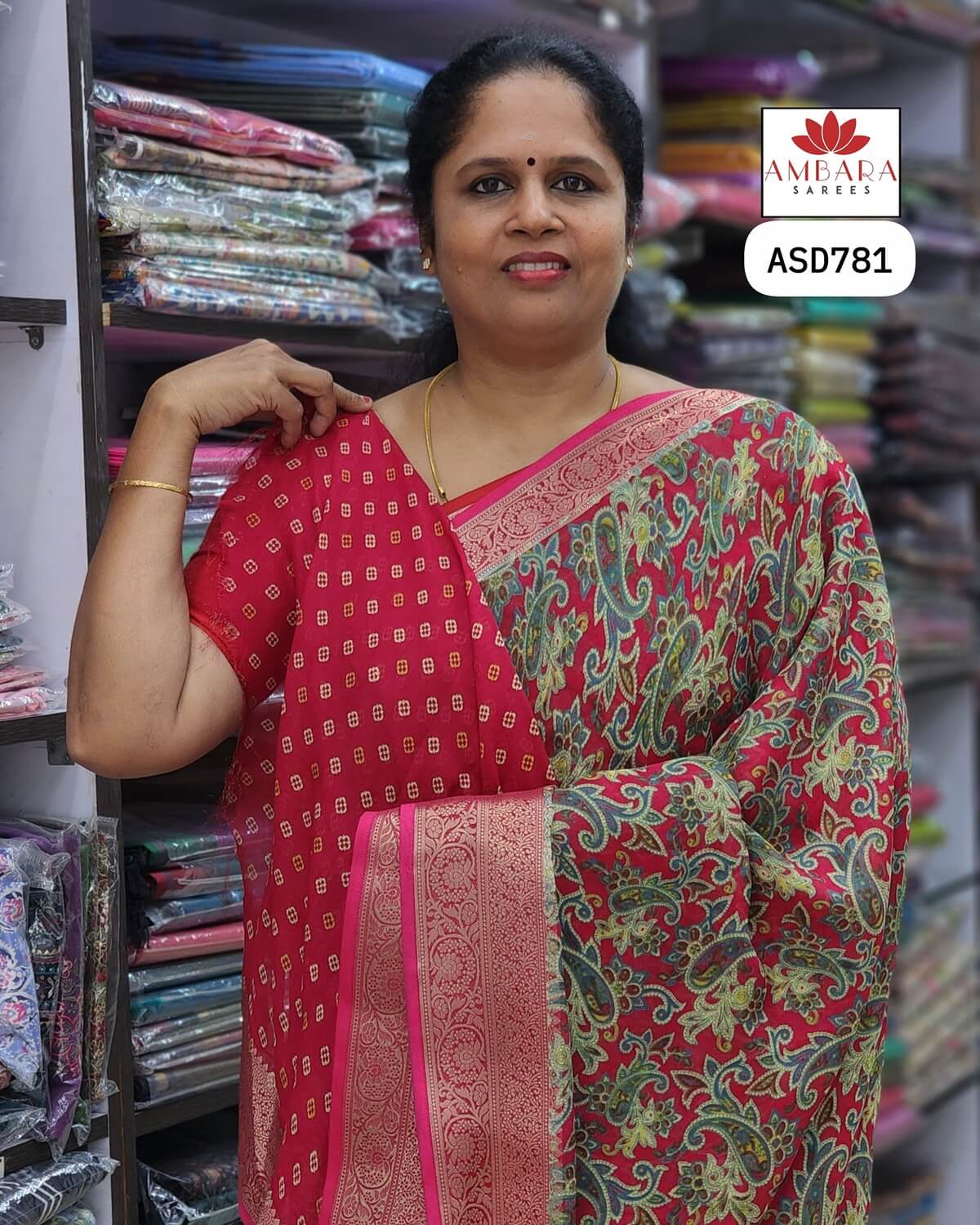 Matching printed blouse piece with designs that align perfectly with the saree’s overall theme