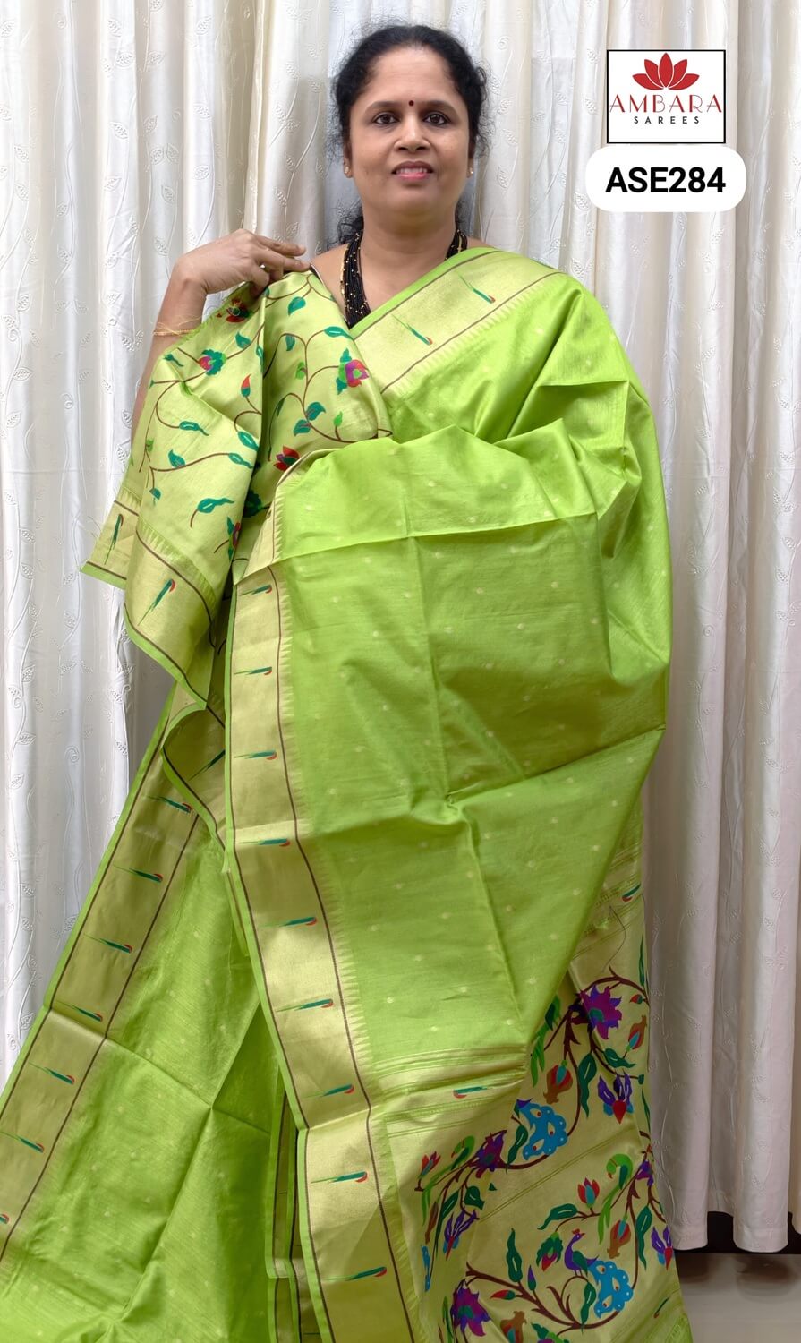 • Paithani border design is intricate, featuring traditional motifs like peacocks, flowers, and paisleys, often in contrasting or gold threads.